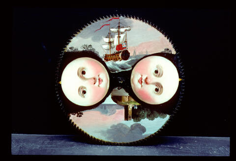 Moon faces: sweet and rather pensive. Moon scenes: very unusual ship with men on yardarm; lakeside scene with rather pink sky.